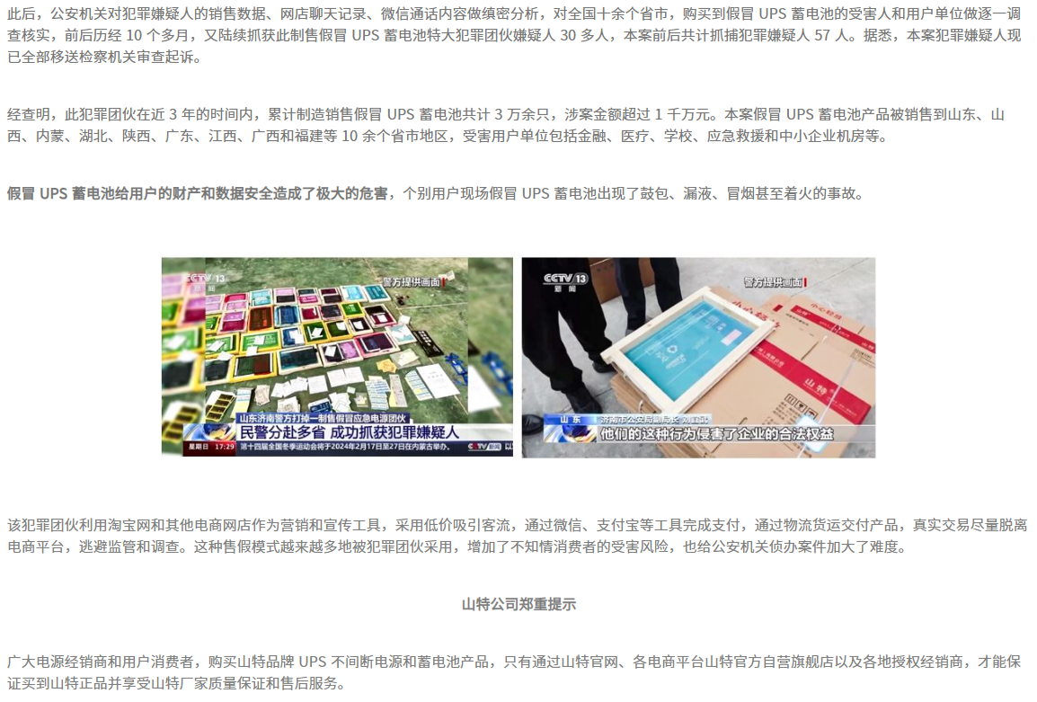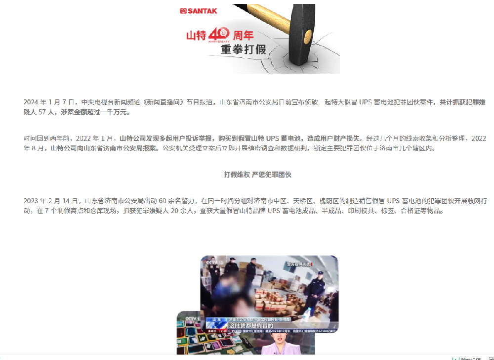 货值千万假冒山特蓄电池犯罪团伙案件侦破,山特 40 周年重拳打假捷报 所属分类:行业新闻 发布时间:2024-06-08 17:38:56 上一条:品牌保护月 | 品牌保护在行动!侵权人开设假冒山特网站,被北京市场监管部门处罚 下一条:没有了!