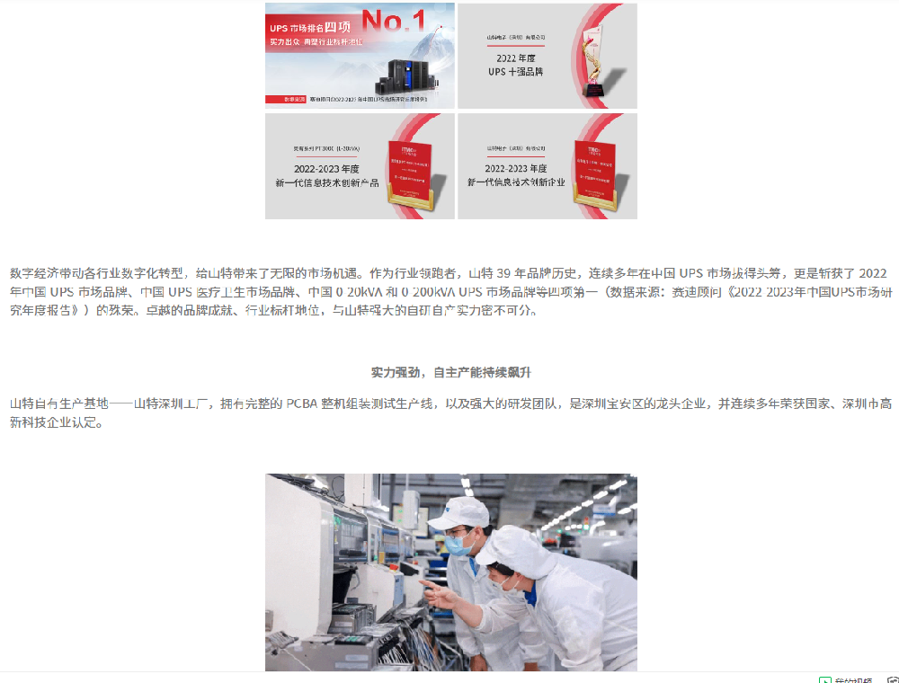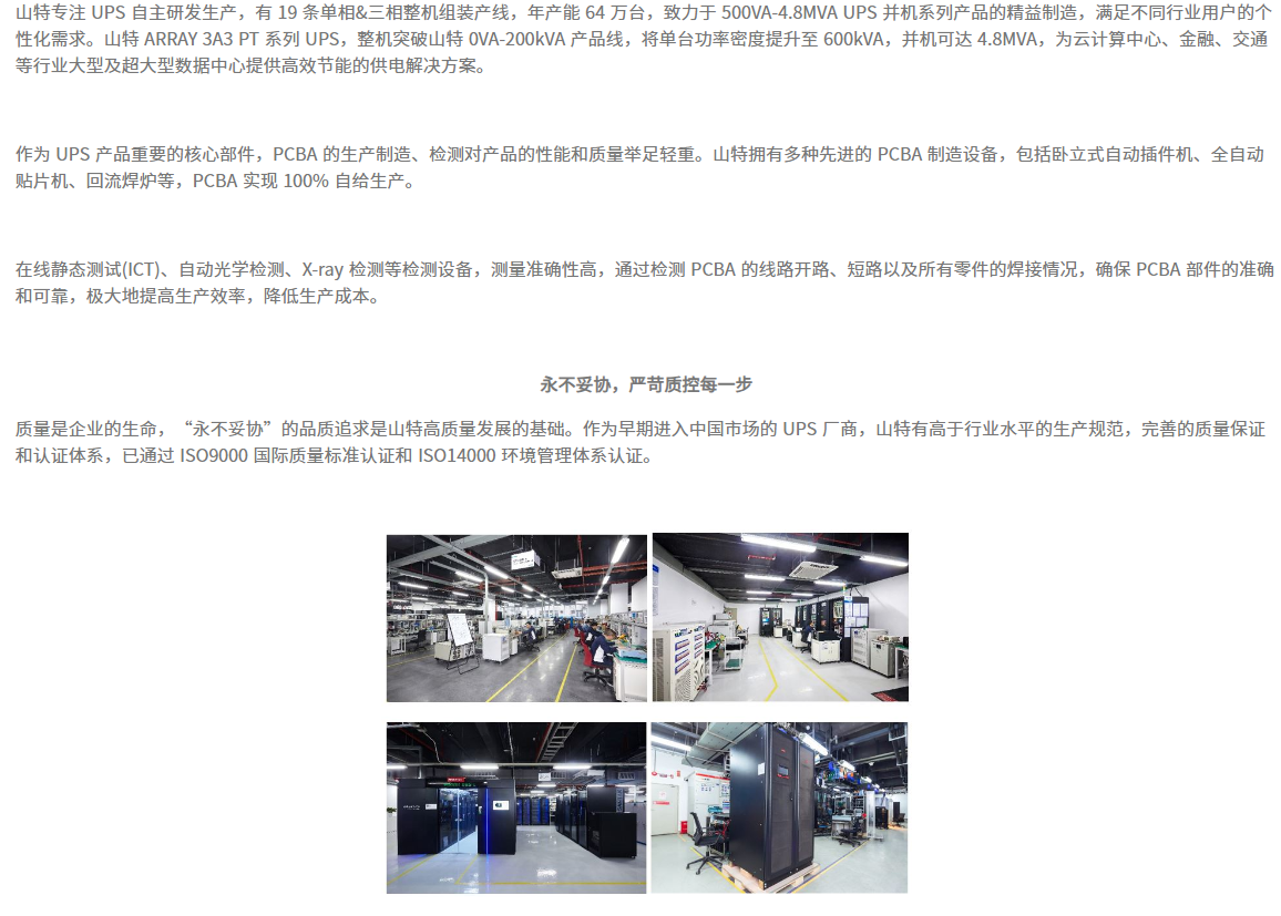 多次斩获UPS 市场品牌第一,探寻山特生产基地的强劲实力 所属分类:公司新闻 发布时间:2024-06-08 17:30:37 上一条:燃夏UPS 用山特 | 燃夏硬核新品,山特高可靠 SIU 系列工业级 UPS 重磅上市! 下一条:势不可挡,全面迸发!山特 3C3 HD 20-600kVA UPS 全家族正式集结